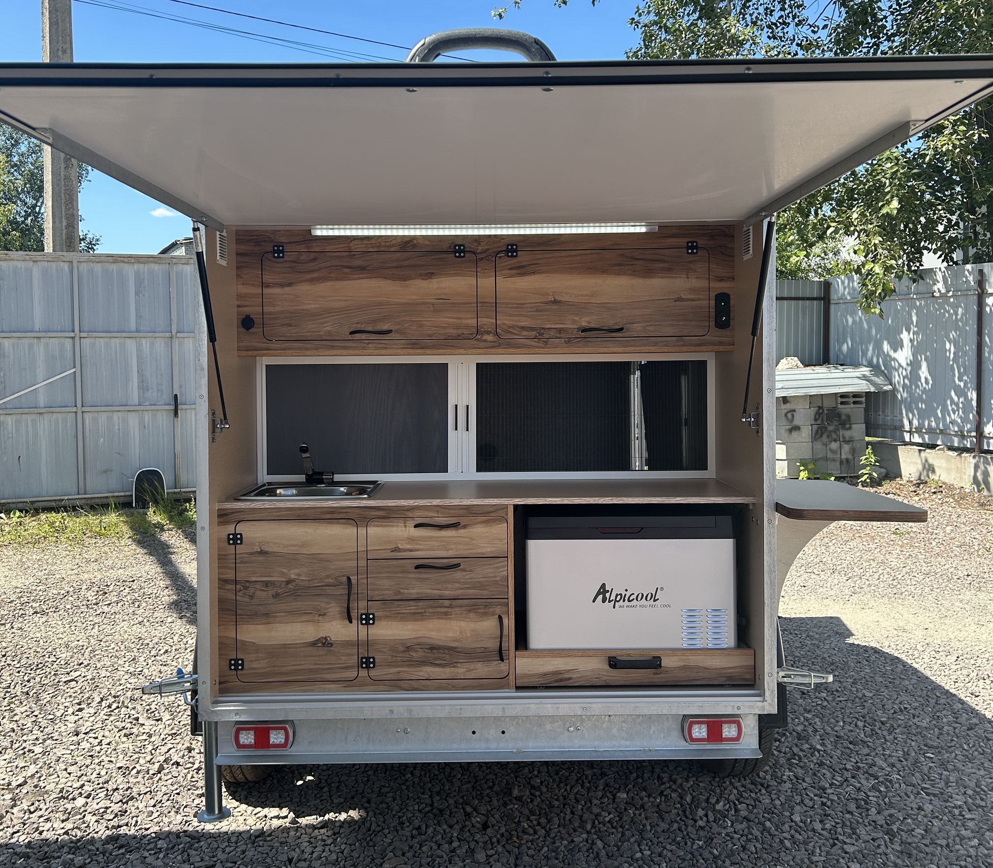 Лёгкий и практичный прицеп весом от 450 кг идеально подходит для путешествий семьи из трёх человек. Он легко буксируется легковым автомобилем от 90 л.с. Выполнен из сэндвич-панелей толщиной 28мм. Влагостойкие материалы отделки. Доступ к кухонной зоне осуществляется снаружи, через заднюю подъёмную крышку.